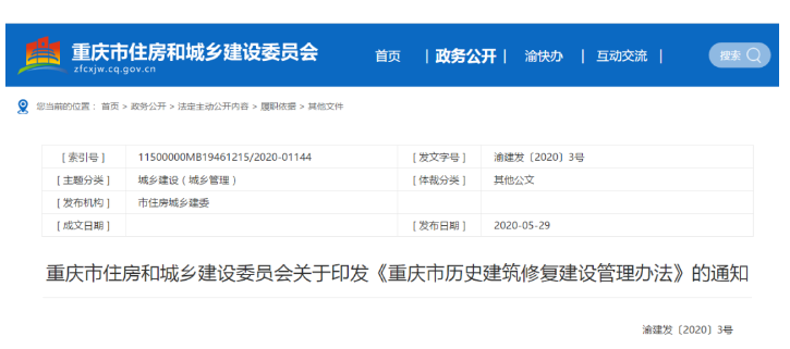 关于印发《重庆市历史建筑修复建设管理办法》的通知