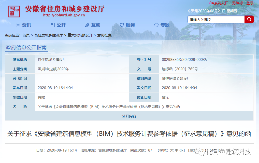 为贯彻落实《国务院办公厅转发住房城乡建设部关于完善质量保障体系提升建筑工程品质指导意见的通知》(国办函〔2019〕92号)和《住房城乡建设部关于印发推进建筑信息模型应用指导意见的通知》(建质函〔2015〕159号),进一步推进我省建筑信息模型(BIM)技术应用,我厅组织制定了《安徽省建筑信息模型(BIM)技术服务计费参考依据(征求意见稿)》,现送你们征求意见,请于2020年9月11日前将书面意见(连同电子版)反馈我厅标准定额处。
